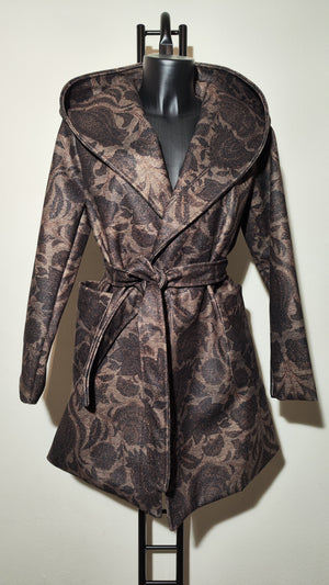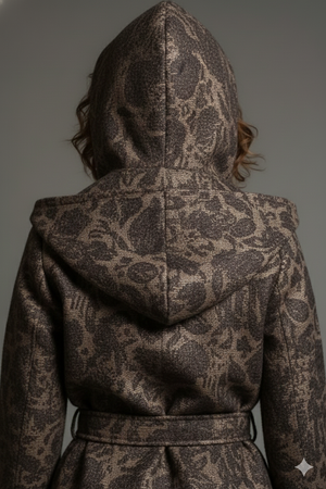 La cintura in vita valorizza la silhouette, mentre il cappuccio ampio aggiunge un dettaglio casual-chic che rende il modello perfetto sia per il giorno che per la sera.