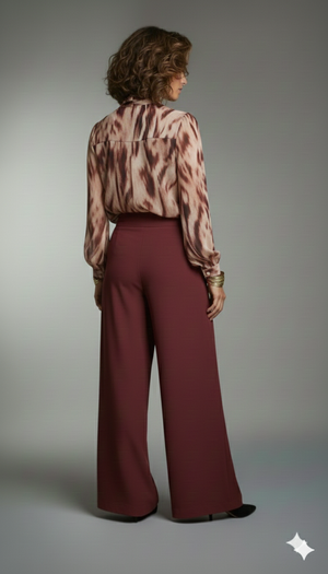 La camicia Eterna Soirée unisce la leggerezza dei volumi alla forza di una fantasia pennellata nei toni del borgogna, del nude e dell’amaranto. Le balze morbide che scendono sul davanti a coprire i bottoni creano un effetto movimento sofisticato, mentre il fiocco al collo, regolabile, aggiunge un tocco di femminilità sartoriale.