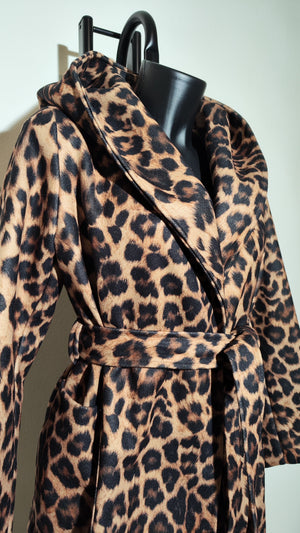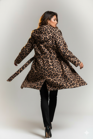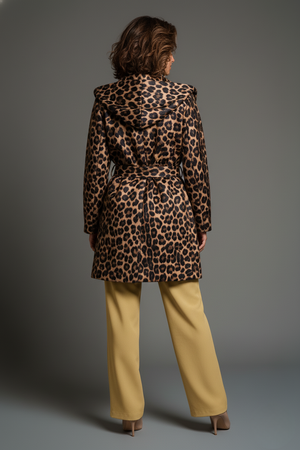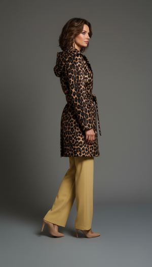 Il taglio con cappuccio e la cintura coordinata in vita valorizzano la figura, mentre la fantasia animalier dona un tocco audace e sofisticato, ideale per look da giorno e da sera.