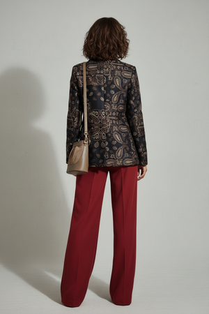 Raffinata e contemporanea, questa giacca è il capo ideale per chi ama distinguersi con stile. Realizzata in un morbido tessuto strutturato, questa giacca nera presenta una fantasia paisley sofisticata nei toni del marrone e nero che unisce eleganza e personalità.